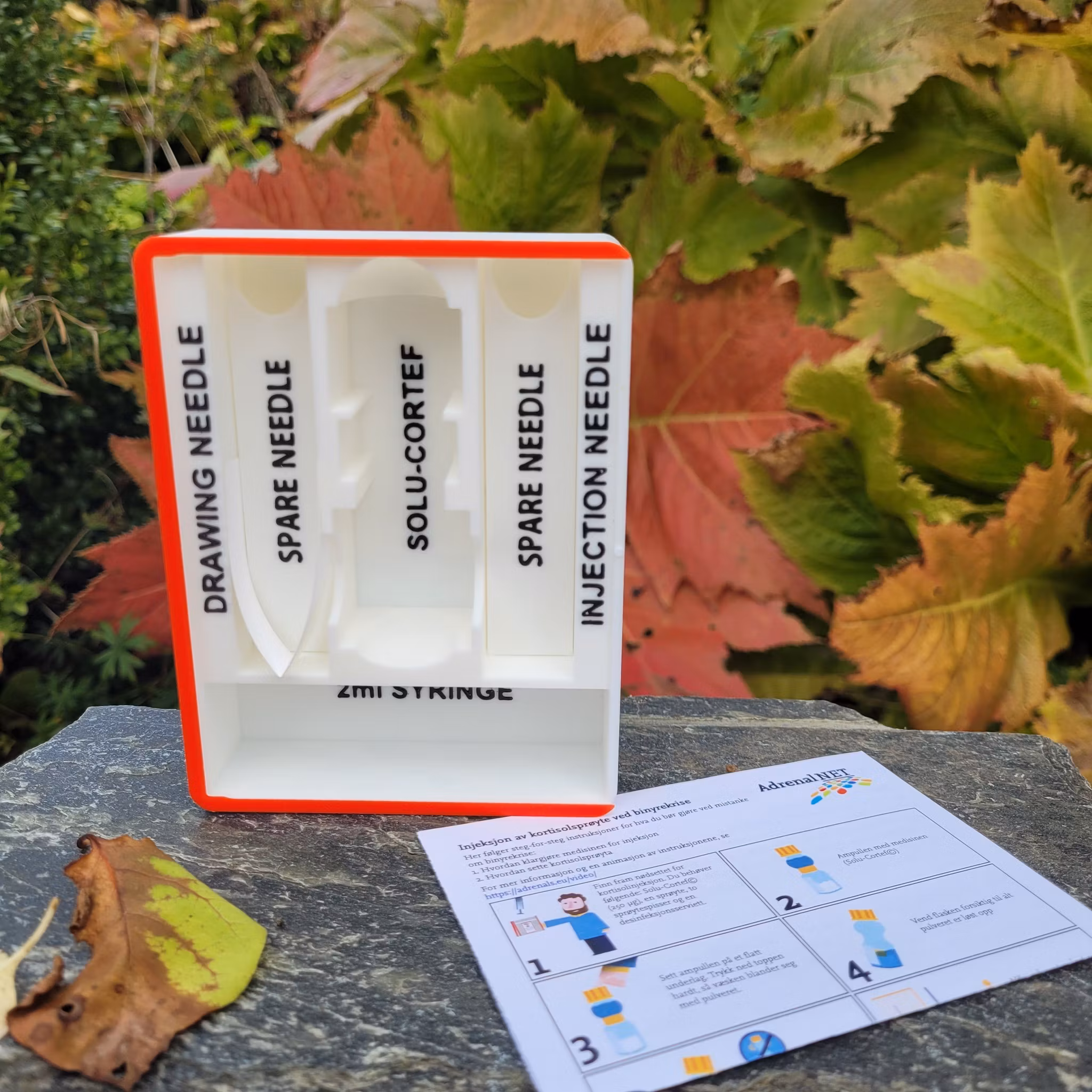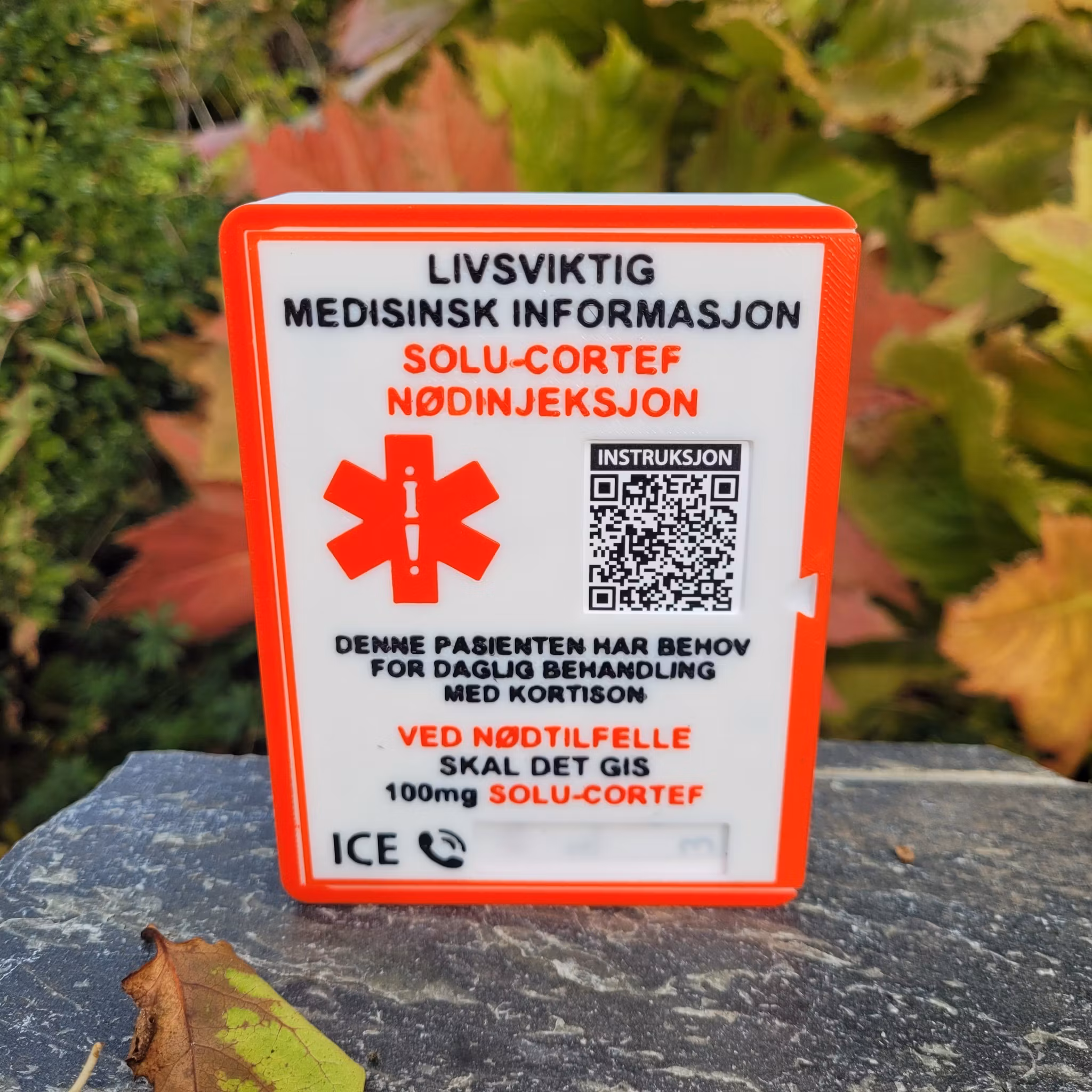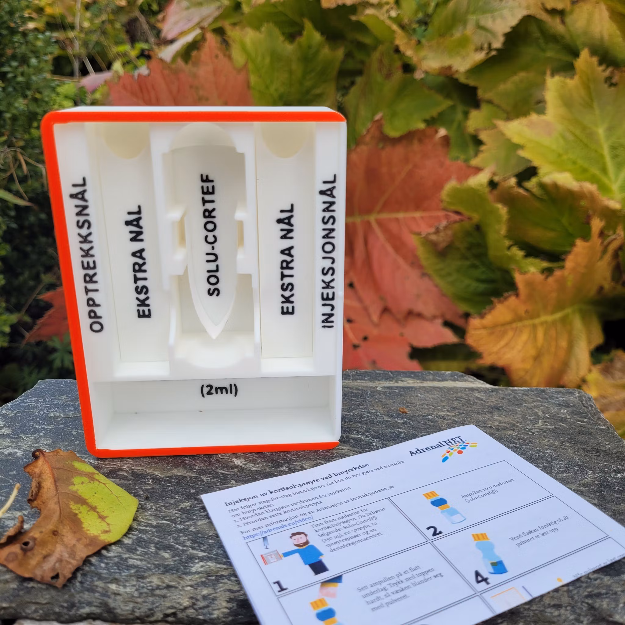 En egendesignet boks til nød-injeksjonssett. Den finnes til barn og voksne, velg riktig når du bestiller.