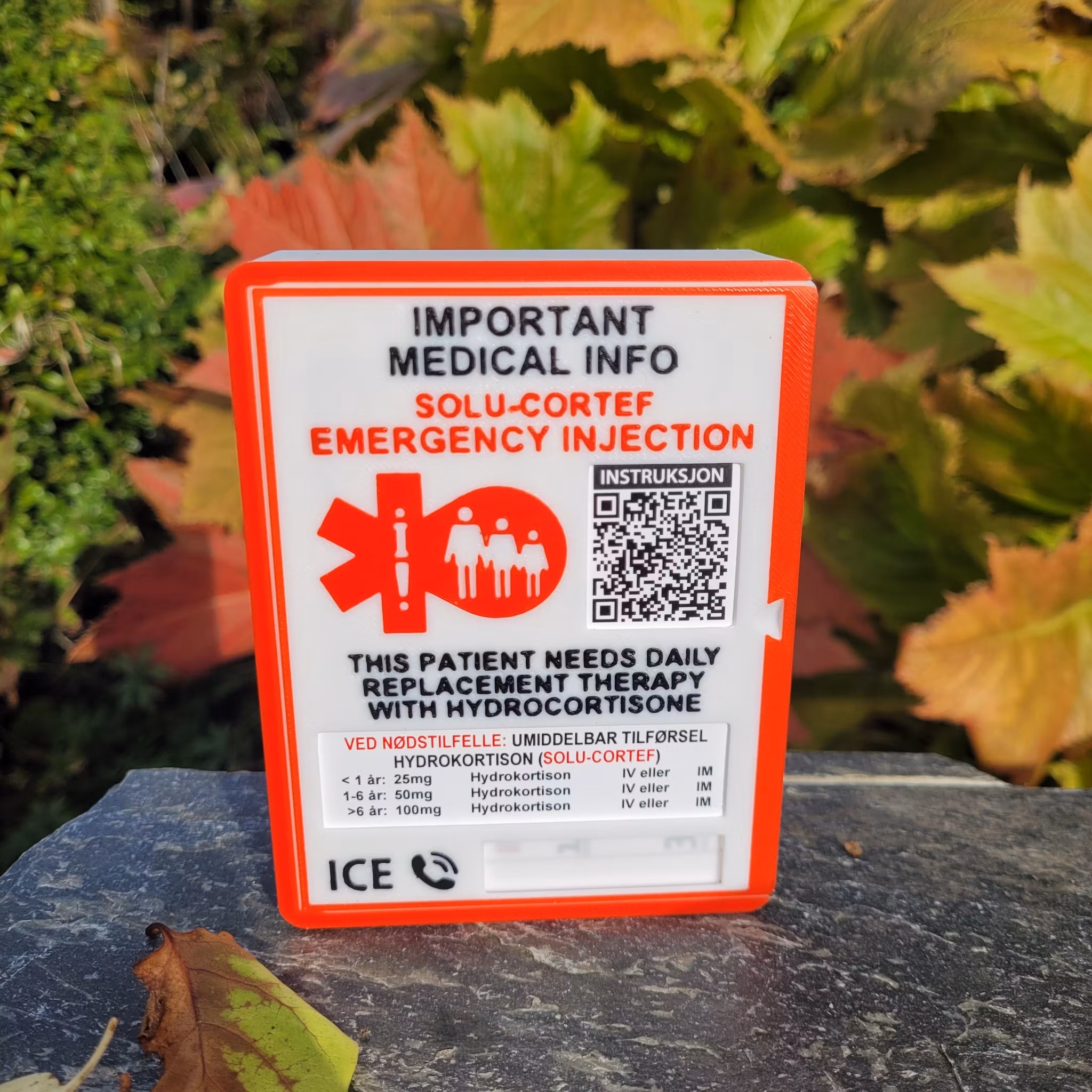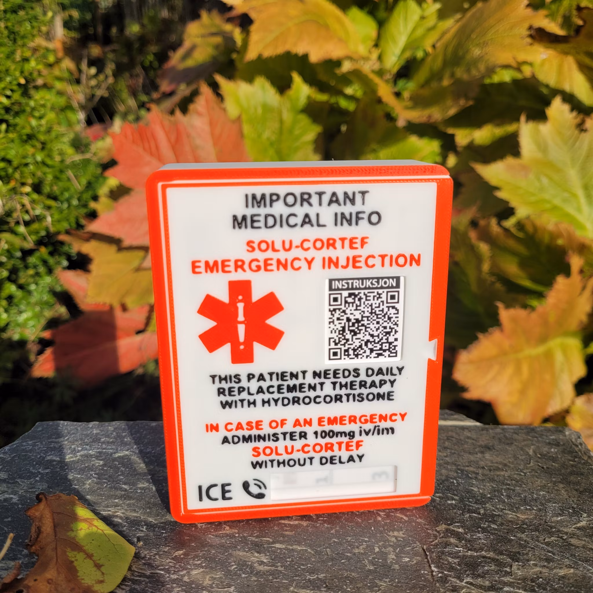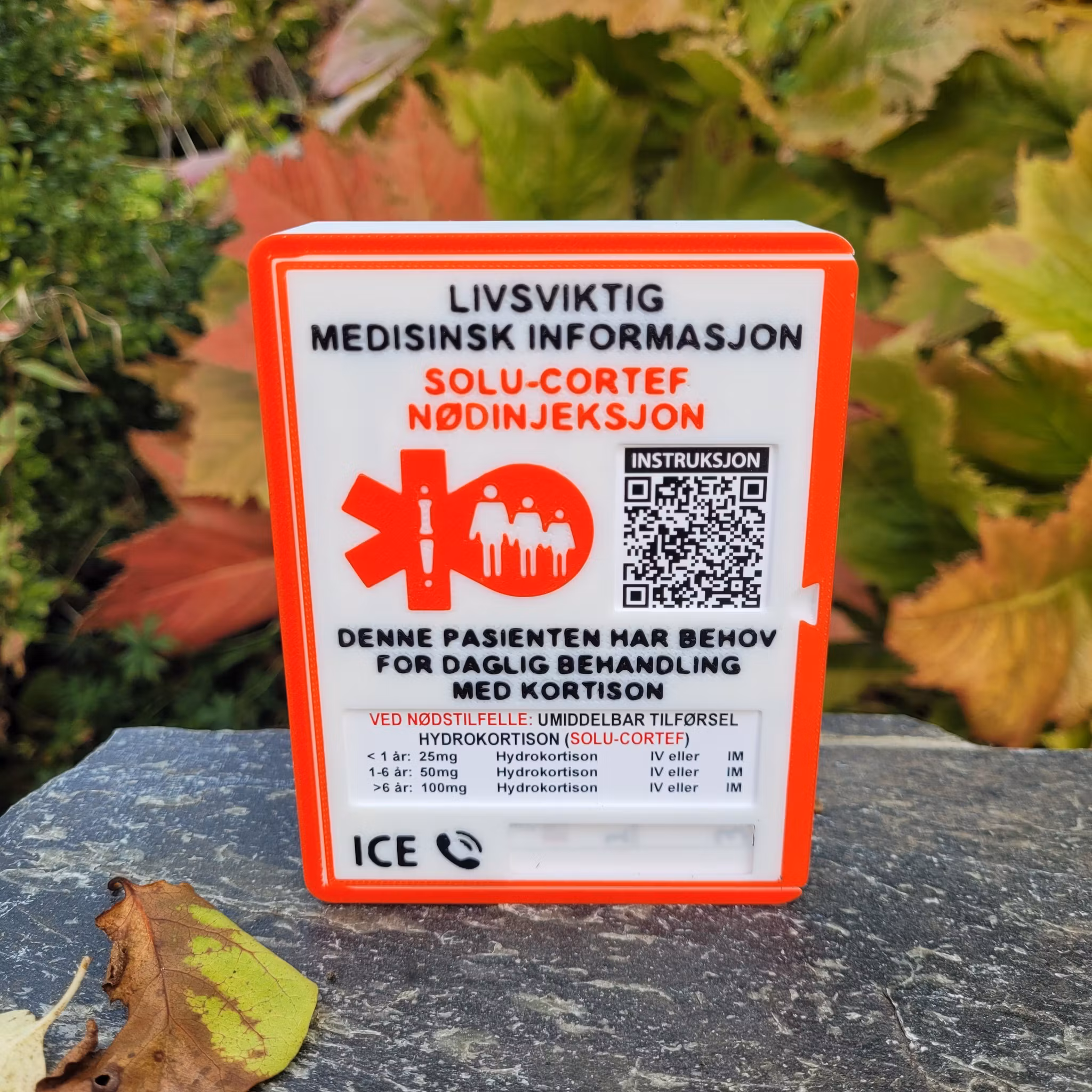 En egendesignet boks til nød-injeksjonssett. Den finnes til barn og voksne, velg riktig når du bestiller.